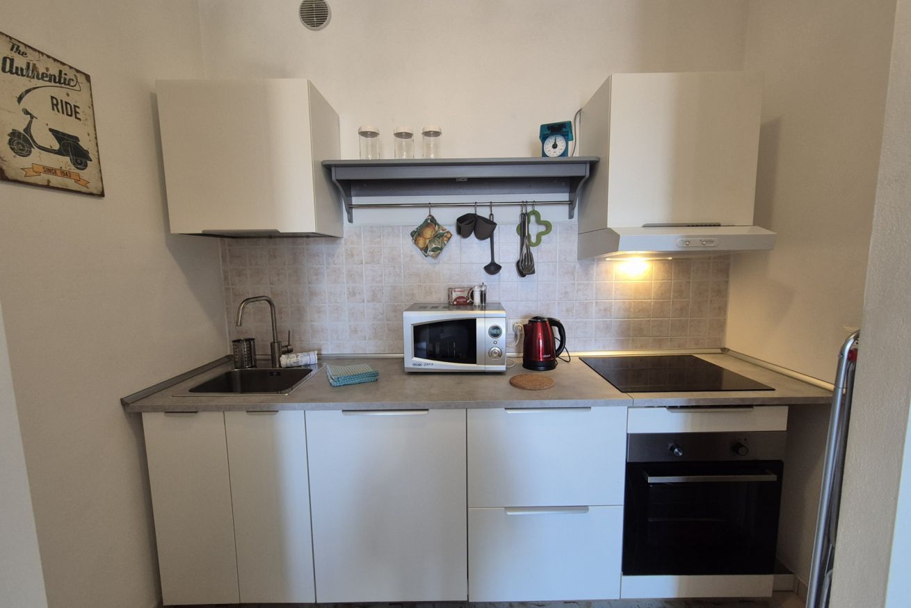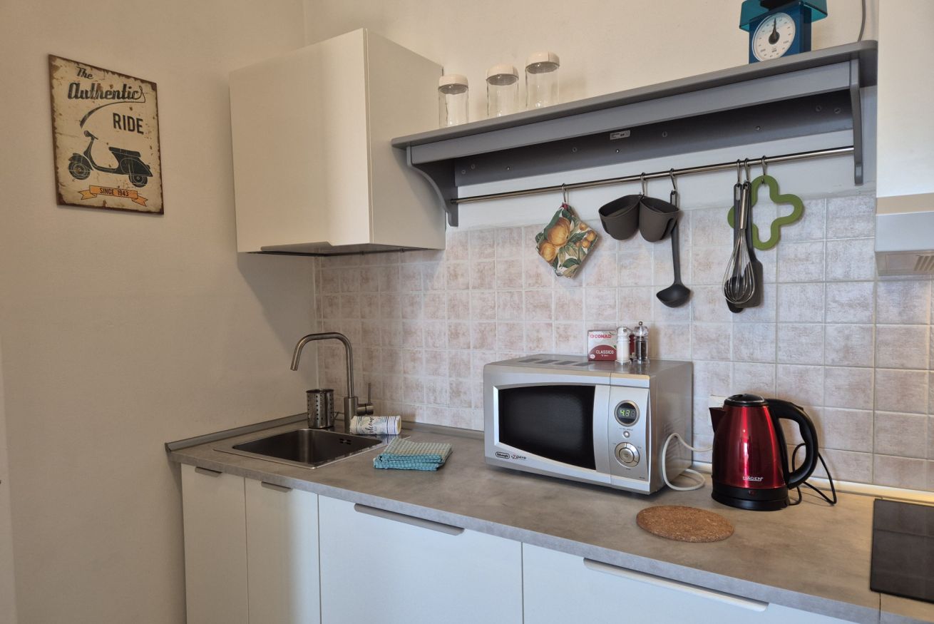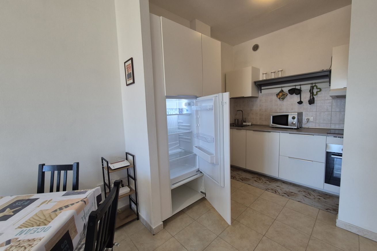 L’appartamento è dotato di aria condizionata per garantire comfort nei mesi estivi, riscaldamento centralizzato per l’inverno, connessione Wi-Fi e televisione. Il condominio dispone di cancello elettrico e di un parcheggio con posti auto liberi non assegnati, soluzione pratica per chi arriva in auto.