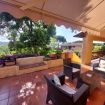 La grande terrazza coperta vista mare, arredata con zona pranzo, lettini, divano e poltrone, è il cuore della casa: perfetta per colazioni all’aperto o tramonti sul golfo di Portoferraio.